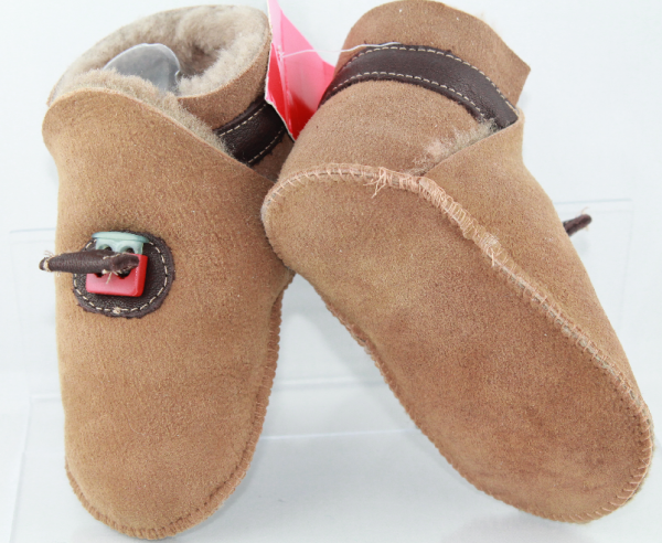 Die Babyschuhe sind aus weichem, kuscheligen Lammfell. Die Nahtkanten sind innen weich verarbeitet und halten Babys Füße rundum warm.
